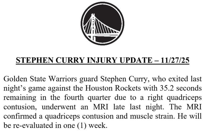 北京时间11月28日,勇士官方宣布,库里已接受核磁共振检查,确诊四头肌挫伤和肌肉拉伤,一周后重新评估。库里未出现严重伤病,对于勇士和库里本人来说,都算是不幸中的万幸。